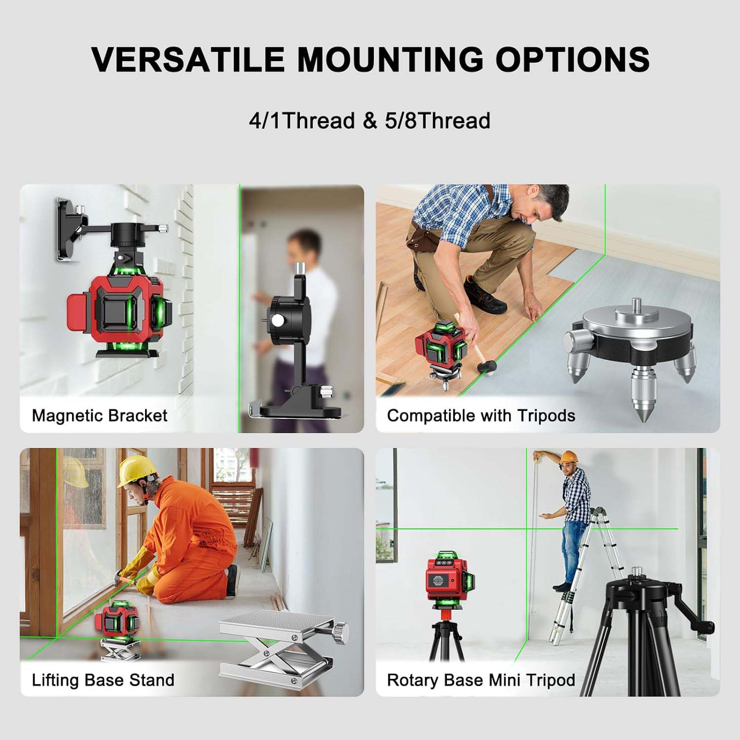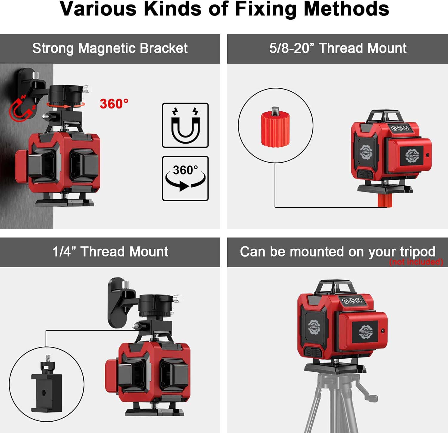 1. Olika fixeringsmetoder:Den är utrustad med ett starkt magnetiskt fäste, vilket ger ett stabilt och bekvämt sätt att fixera lasernivån i många situationer. 5/8 - 20" gängfästet möjliggör anslutning till specifika enheter eller strukturer med denna typ av gänga. 1/4" gängfästet erbjuder även ett annat alternativ för montering, vilket ökar dess kompatibilitet med olika tillbehör.